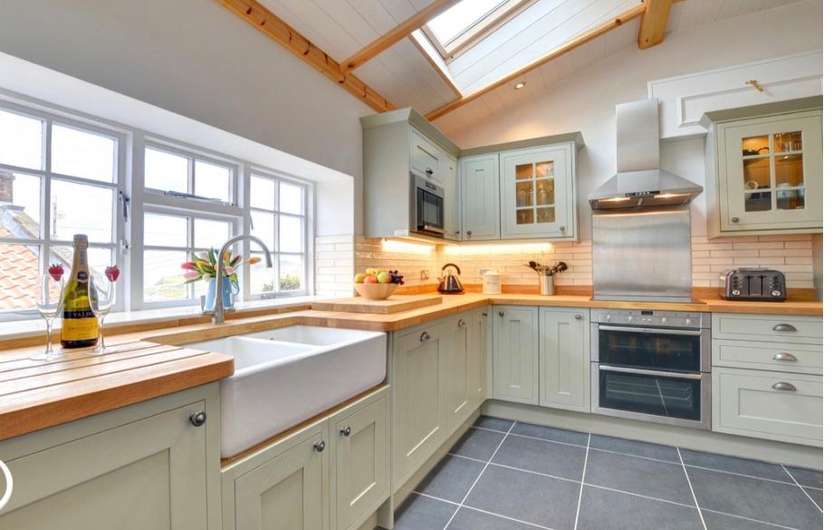 Dining/Kitchen: Large dining kitchen fully equipped with large fridge freezer, induction hob, electric oven & grill, microwave, washing machine, dishwasher, double Belfast sink, wooden table, monks bench & wall mounted TV. Step to stable door (emergancy exit only) & view to Robin Hoods bay.