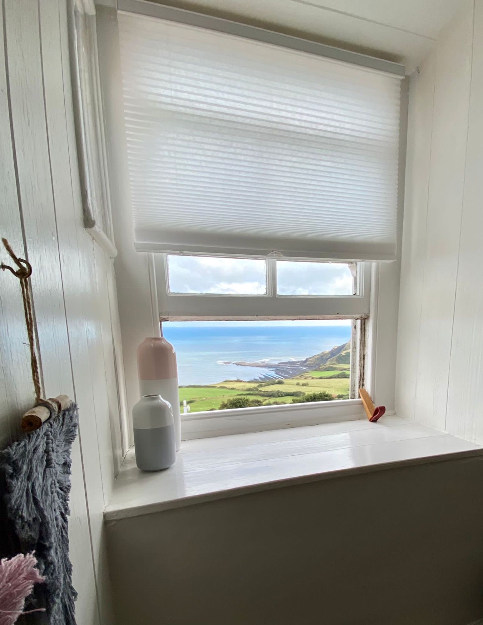 Bedroom 1: Snug King size bed, bedside drawers, cabinet & single wardrobe. There's a window seat accessed via a small step ladder with spectacular sea views. The perfect place to cuddle up with a book.